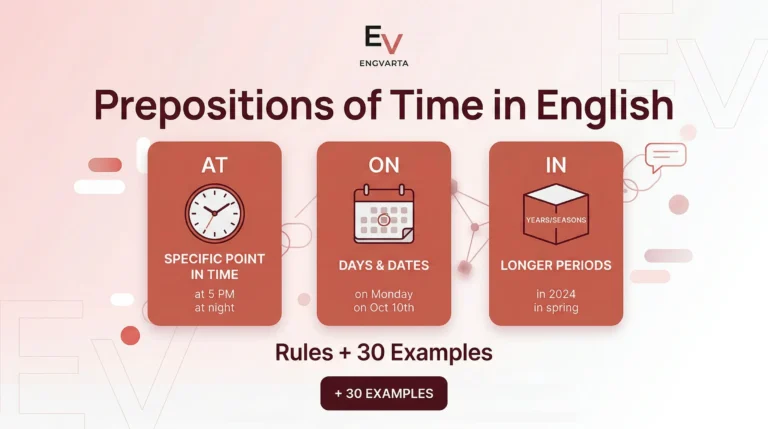 This guide on prepositions of time in English includes three simple rules, 30+ real-life examples, and common mistakes Indian speakers make (with corrections).